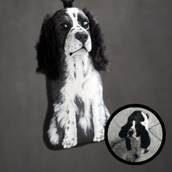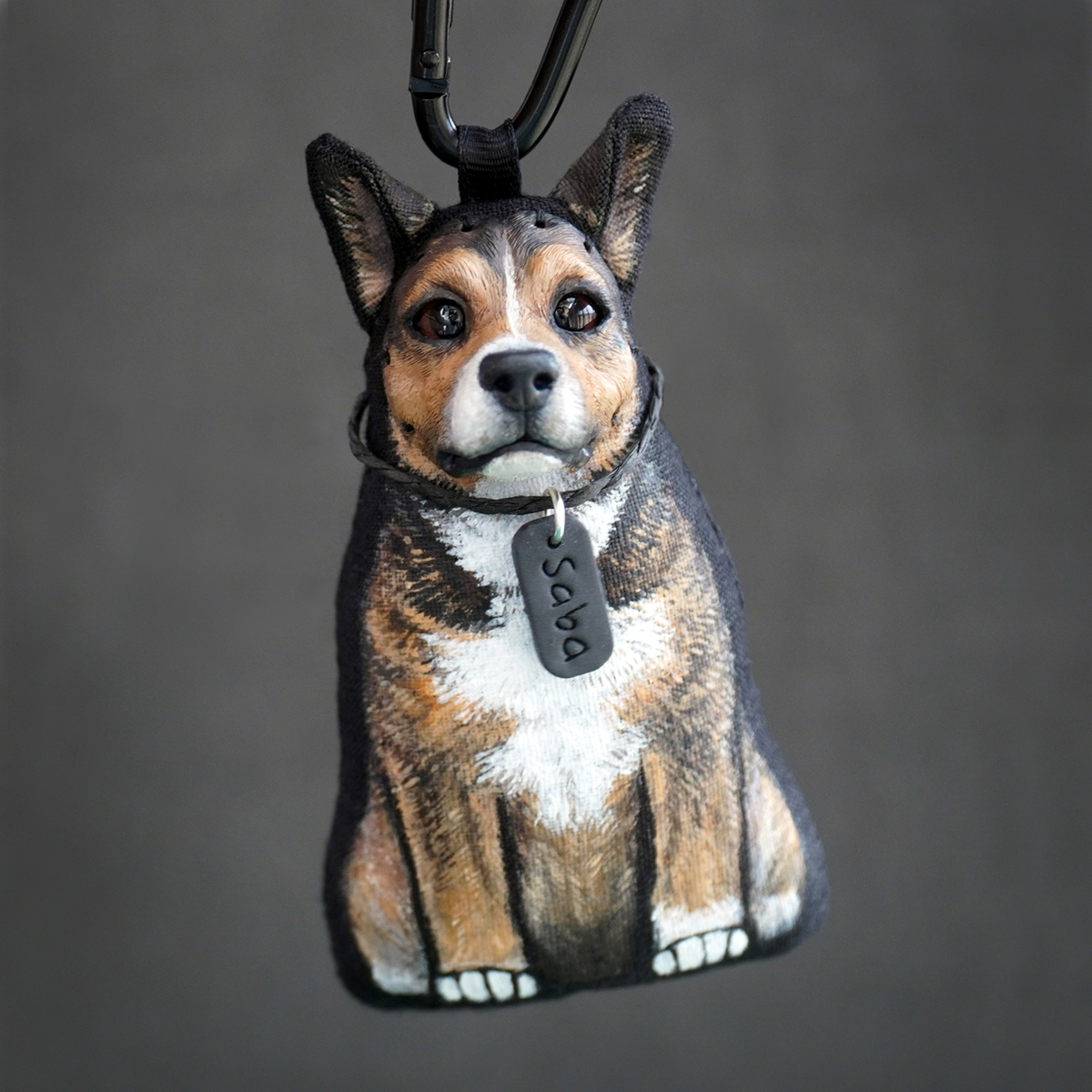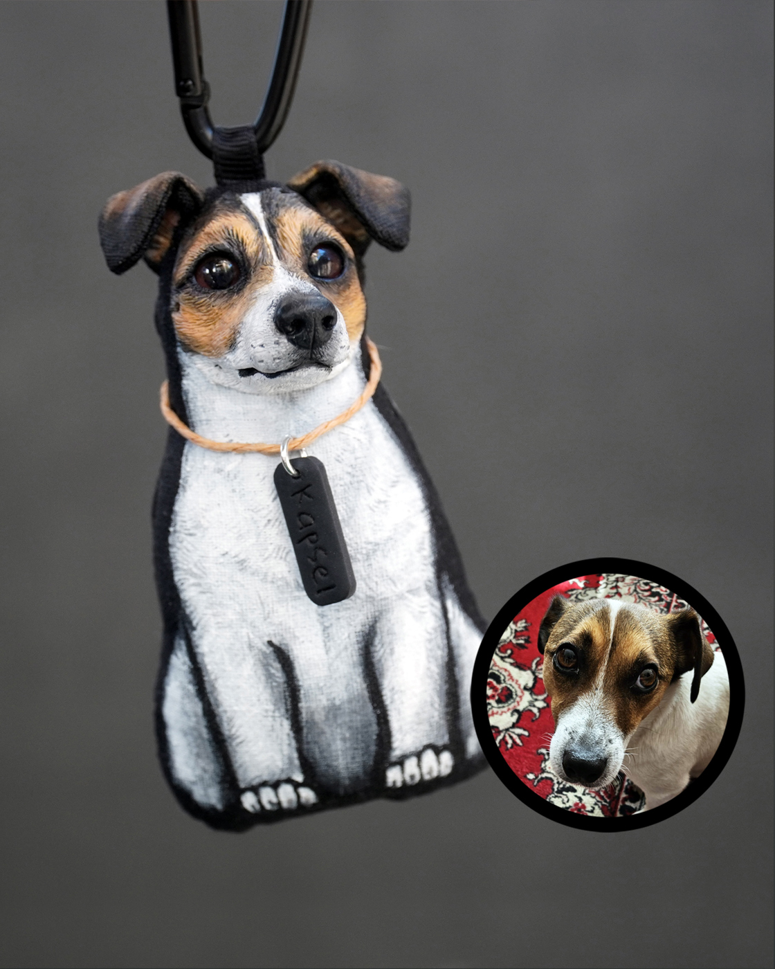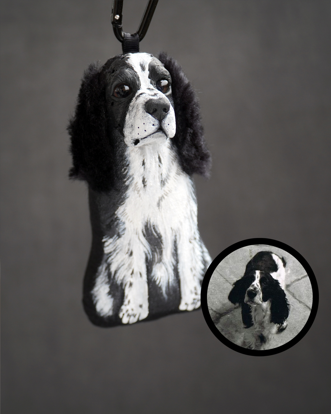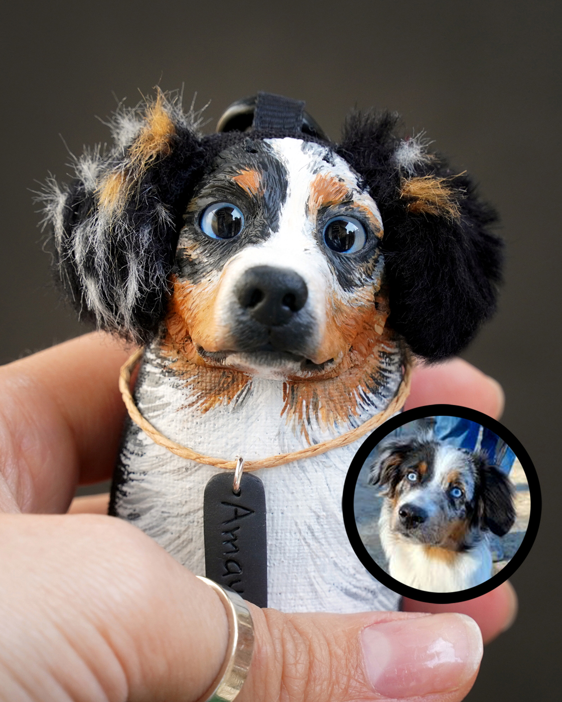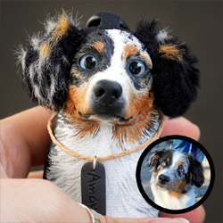Wszystkie Pieski są personalizowane i_powstają w oparciu o wysłane do mnie zdjęcia pupila. Każdy Psiak ma mały imiennik na szyi. Oczy są wykonane ze szklanych kaboszonów. Można wybrać kolor tęczówki i_kilka dodatków jak: skrzydełka dla psich aniołów czy ukryte serduszko z sierścią zwierzaka.