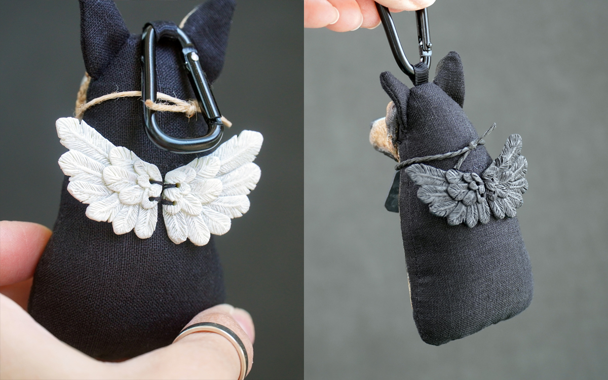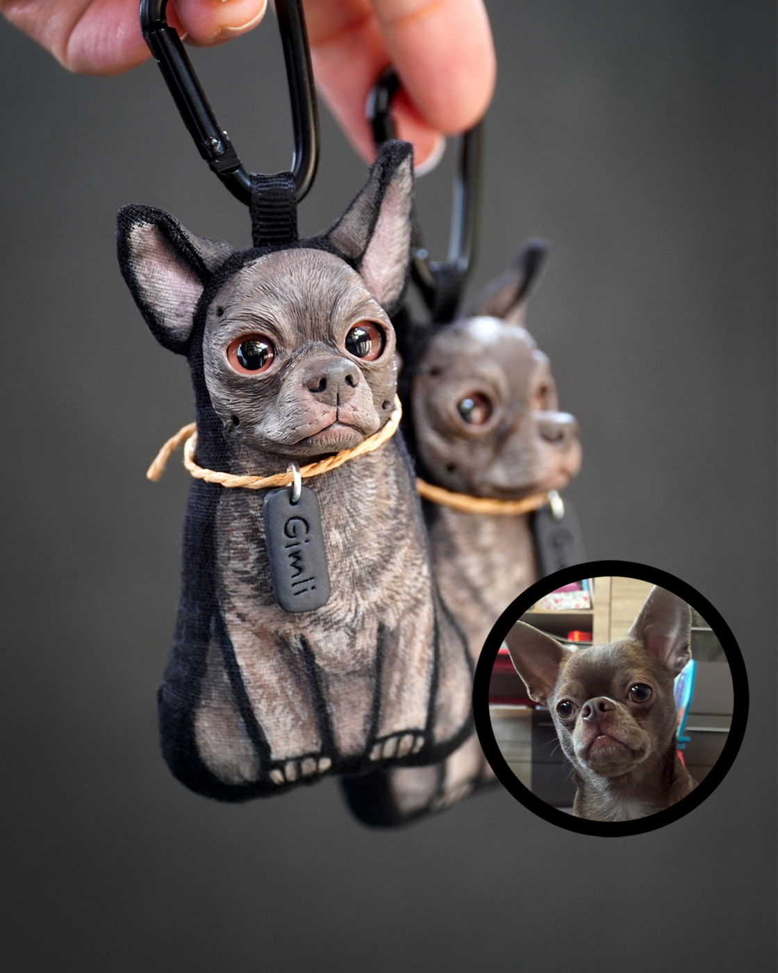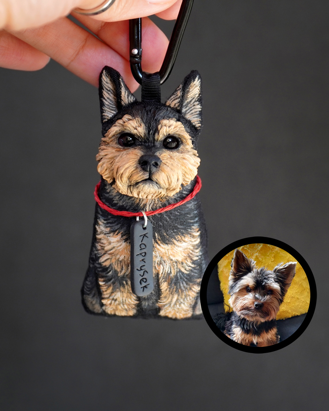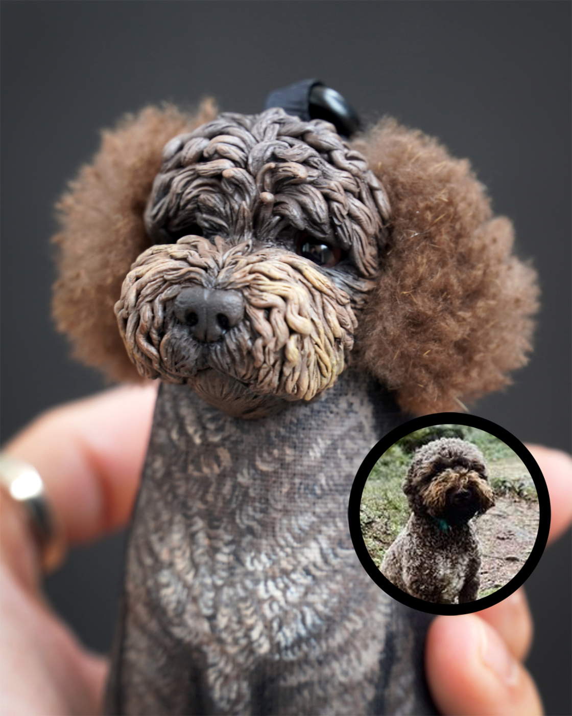 Wszystkie Pieski są personalizowane i_powstają w oparciu o wysłane do mnie zdjęcia pupila. Każdy Psiak ma mały imiennik na szyi. Oczy są wykonane ze szklanych kaboszonów. Można wybrać kolor tęczówki i_kilka dodatków jak: skrzydełka dla psich aniołów czy ukryte serduszko z sierścią zwierzaka.